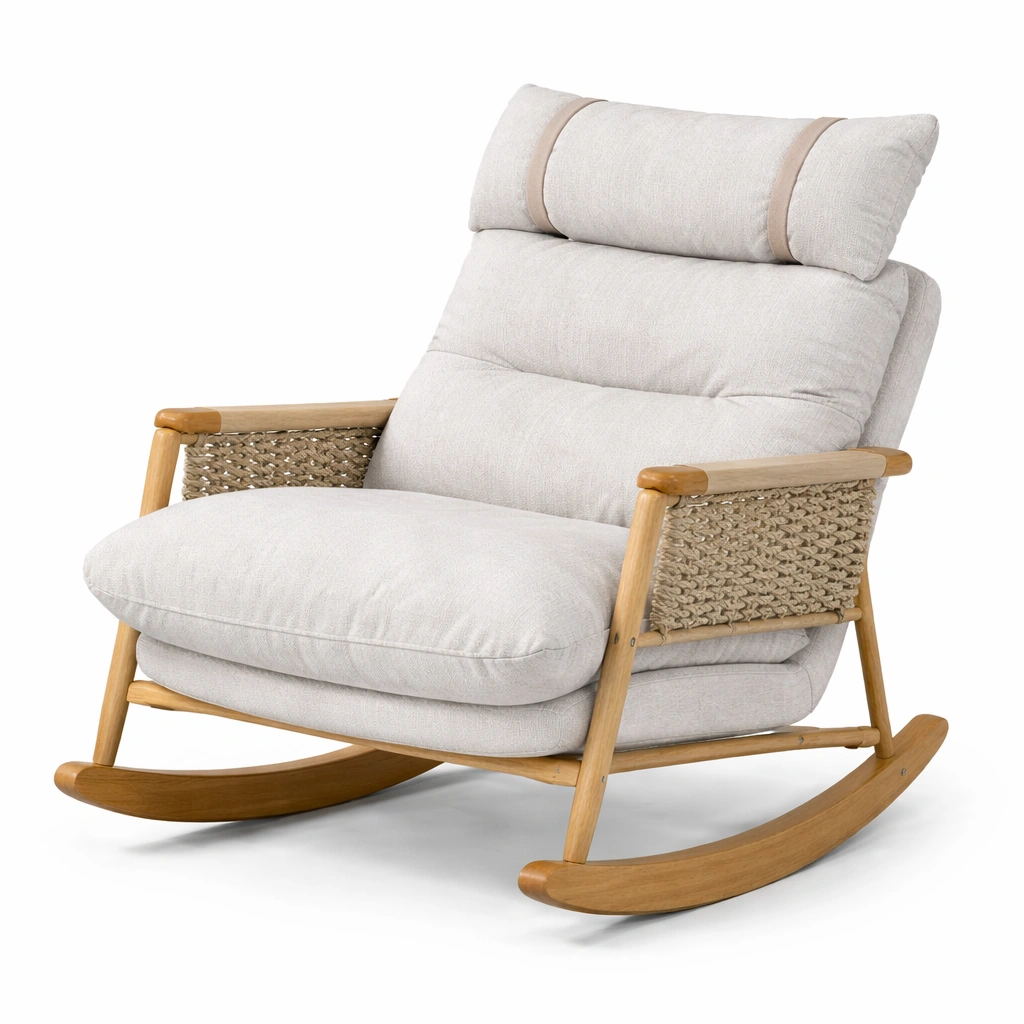 Der Schaukelstuhl besteht aus einem robusten Gestell aus Akazienholz. Die Sitz- und Rückenpolster sind aus Leinen gefertigt und mit Polyurethanschaum gefüllt. Die Seiten sind mit geflochtenem Seil akzentuiert, was dem Design eine stilvolle Note verleiht. Geeignet für den Innenbereich.